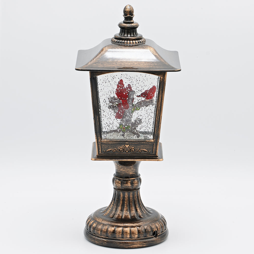 12"H Confetti Lites Lighted Swirl Pedestal Lantern with Cardinals on a Snowy Branch